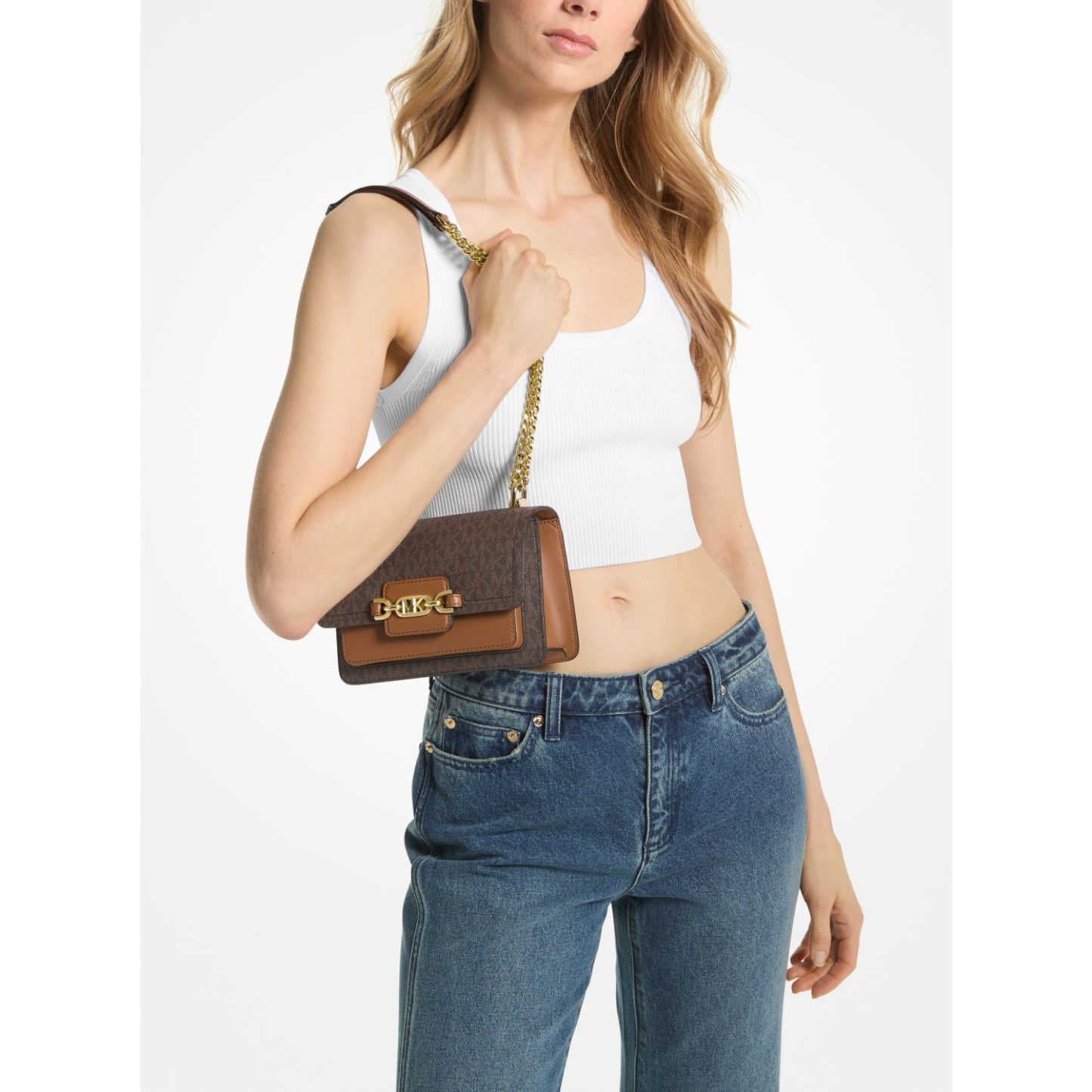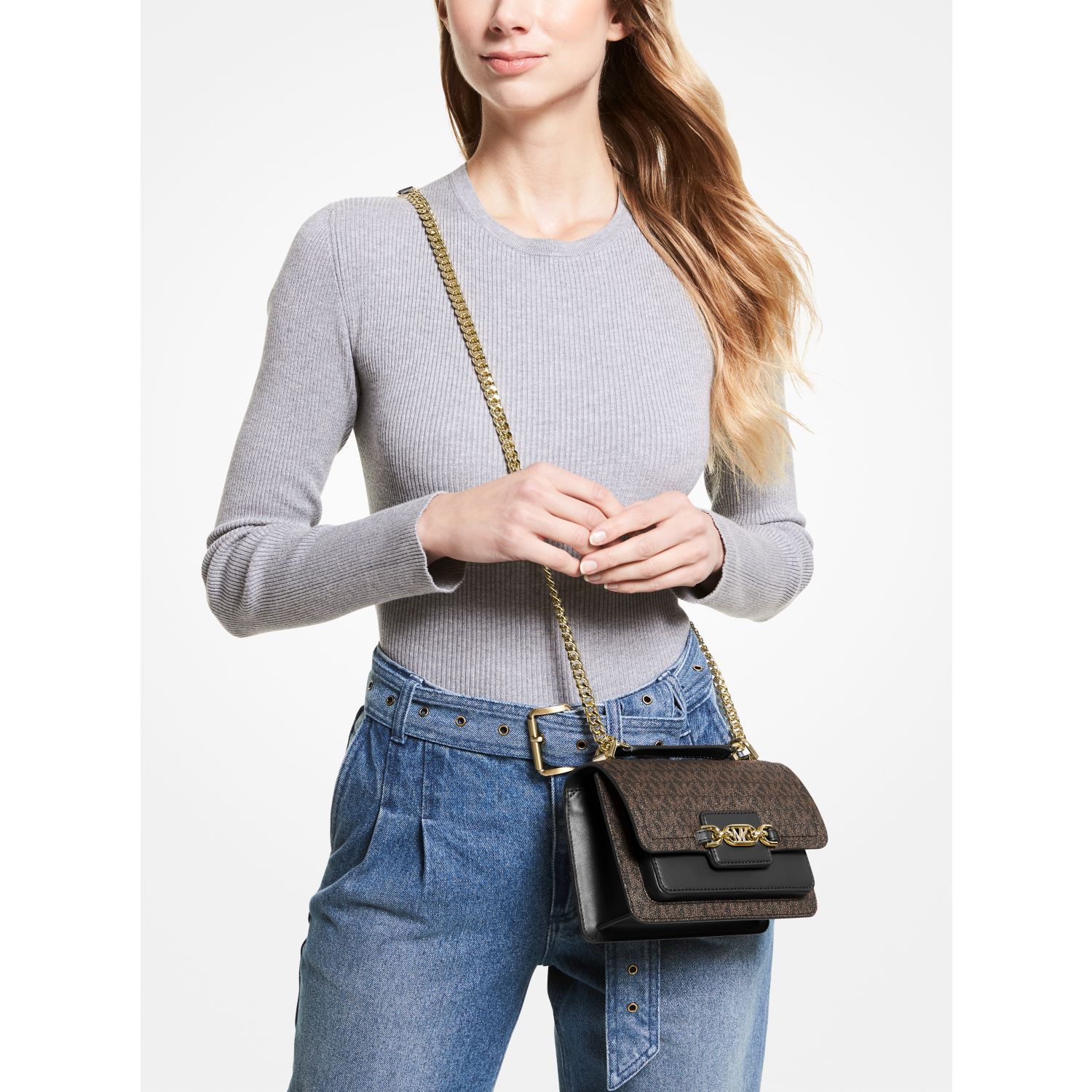 A smart and polished piece for every day, the Heather crossbody bag is crafted from Signature-print canvas in a modern fold-over silhouette with branded hardware for a novelty finish. It opens to a compact interior that’ll hold just the essentials—think your phone, card case and lipstick.