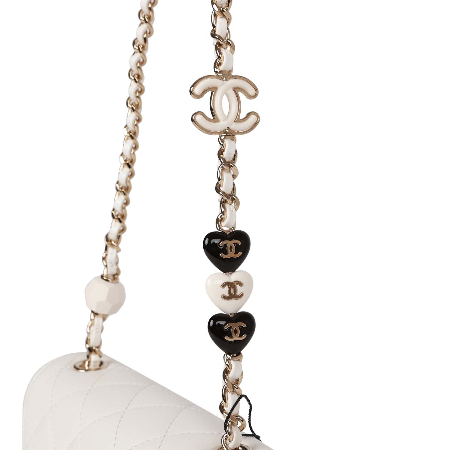 This Mini Square flap bag is of White lambskin with light gold tone hardware and has a front flap with signature CC turnlock closure, rear half moon pocket, single interwoven white leather and light gold tone chain link shoulder/crossbody strap with three CC hearts and an enamel white CC logo.